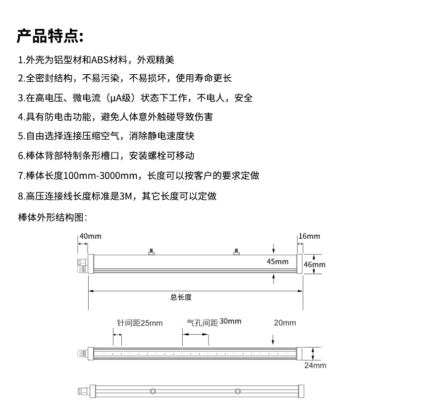 施莱德脉冲除静电风棒,型号DR-069是一种可选择连接或不连接压缩空气的棒型除电装置,消除静电时间特别快,残余电压特别低,未连接压缩空气的消除静电距离建议在20-100mm以内,连接压缩空气的消除静电距离建议在50mm到1米以内。它需要配套对应的电源发生器,型号DR-009才可使用。